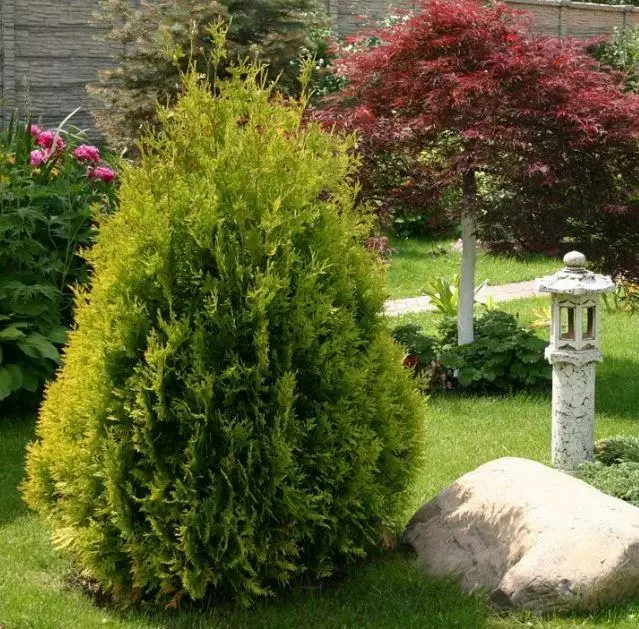 живоплотів. Туя з яскраво-жовтою хвоєю ефектно виглядає в поєднанні